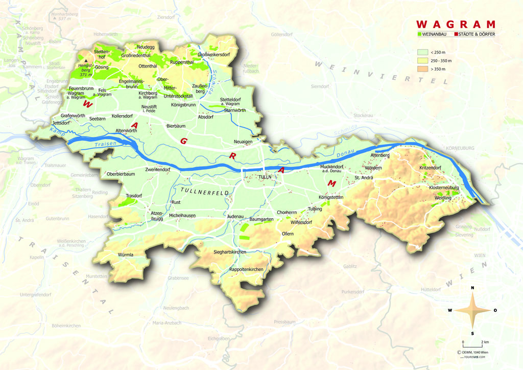 Liebevoll auch als Piemont von Österreich genannt, erstreckt sich der Wagram von der Donau zwischen Krems und Klosterneuburg und bietet jede Menge hervorragenden Weinbau durch seine lössreichen, kalkhaltigen Böden. Dazu passend gibt es auch Hervorragendes an Kulinarik entlang der Strecke. Aus der Spitzengastronomie bekannte Winzer wie Bernhard Ott, Anton Bauer, Weingut Karl Fritsch, Clemens Strobl oder Josef Fritz aus Zausenberg und auch sehr viele Geheimtipps wie zum Beispiel Harald Ernst aus Grosswiesendorf finden sich unter einer Ausbaufläche von 2.720 ha und ca. 926 Weinbetrieben aus der Region. Das pannonische Klima lässt vorwiegend Weinsorten wie Grüner Veltliner, Weißburgunder, Roter Veltliner und Zweigelt zu seiner vorzüglichen Reife heranwachsen.